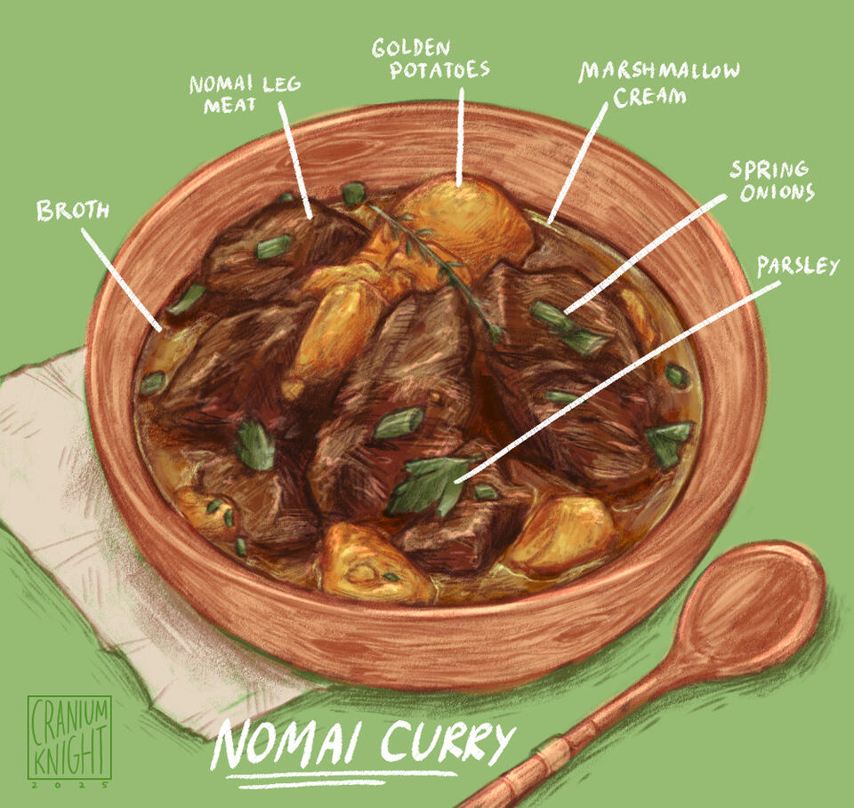 Main: Spicy Nomai curry. Stewed in a fragrant fish broth containing wild berries, onion, habanero, garlic, and ginger found on Timber Hearth. Served in a bowl over a warm bed of wild rice.