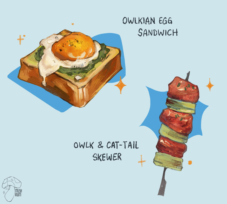 Owlks are of the warm-blooded theropods' family, similar to those of a chicken, duck or owl. While they contain features of other species, such as their antlers and scales, this does little to affect the primary edible parts of their flesh–which would constitute the breast, thighs and wings.Similarly, owlks lay hard-shelled eggs, with unfertilized eggs serving as a protein source for owls as well as other beings. Due to the abundance of eggs compared to population size, these are most favoured as meals. The flavour is similar to a quail or chicken egg. However, the large mass (similar to that of an ostrich) means that one egg can serve multiple meals.It’s theorized that the meat would be sinewy due to the comparative lack of flesh compared to the relative size of owlks.The artificial habit of the Stranger is similar to that of a swamp, where plants such as cat-tail and mint would be able to grow. The watery biome would grow plants such as reeds and kelp, which could be used to make an edible spread.