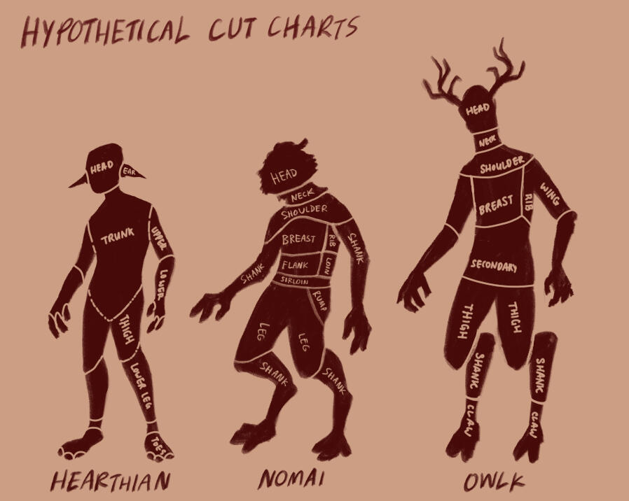 A very brief exploration of the edibility of the 3 main races of Outer Wilds (Dungeon Meshi style).Using both in-game and real life evidence, we hypothesized the tastes, textures, and potential uses of different parts of the aliens. We then made a couple of dishes and drew what they would look like.Additionally, we looked a little bit into the science of creating meat substitutes through mass spectroscopy