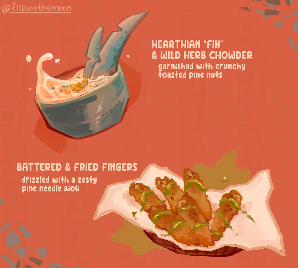 Main: Battered & fried fingers topped with peppery centipede flakes. Served with a zesty pine needle dipping sauce.Side: Hearthian “fin” & wild herb chowder, garnished with crunchy pine nuts. Served with campfire bread.
